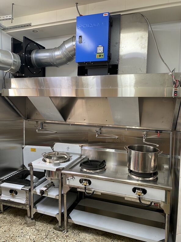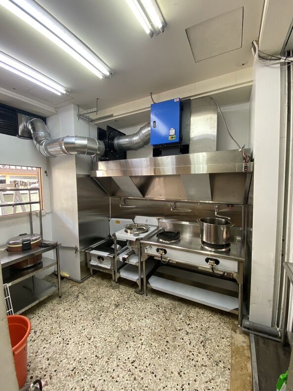 靜電油煙處理機直接安排在煙罩上方,也可以在第一道關卡直接攔截油下來,剩下的就是風排出去而已。