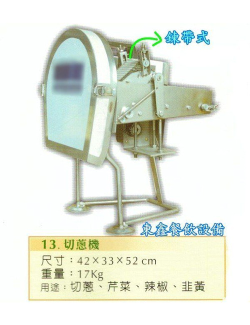 鍊帶式切蔥機 (一般型)鍊帶式切蔥機 / 切丁機 /另有賣水槽.切菜機.封口機 長:42寬:33高:52重量:17KG Line聯絡詳細說明用途:切蔥、芹菜、辣椒、韭黃等分享到FB分享到G+分享到LINEEMAIL到信箱更多商品DETAILSHY-912 泡芙餅乾成型機DETAILS全新鋁合金 石磨機DETAILS全新50人份煮飯鍋DETAILS全新 落地型冰沙機